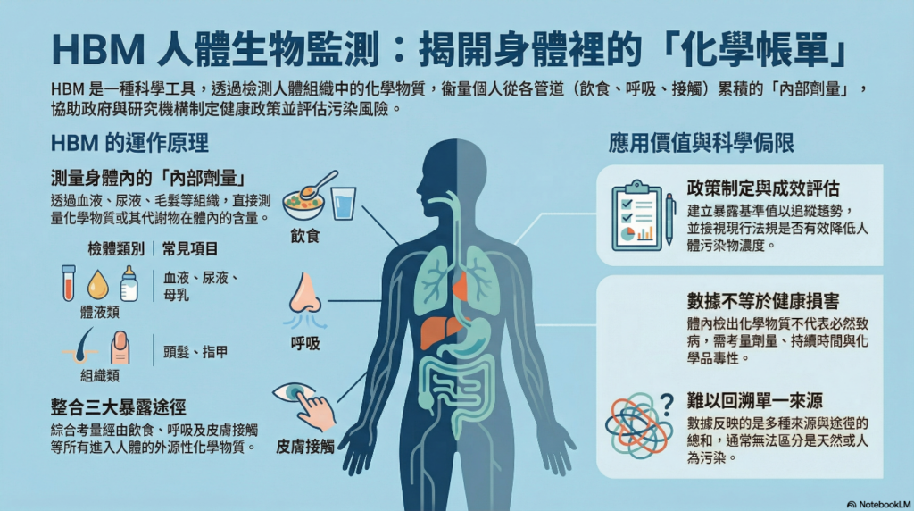 - 無法直接等同於健康損害:HBM 只能告訴我們特定時間點體內含有多少化學物質,但體內存在化學物質並不一定意味著會對健康造成負面影響。是否產生不良影響,還需要綜合考量暴露的劑量、途徑、持續時間、時機以及該化學物質本身的毒性。