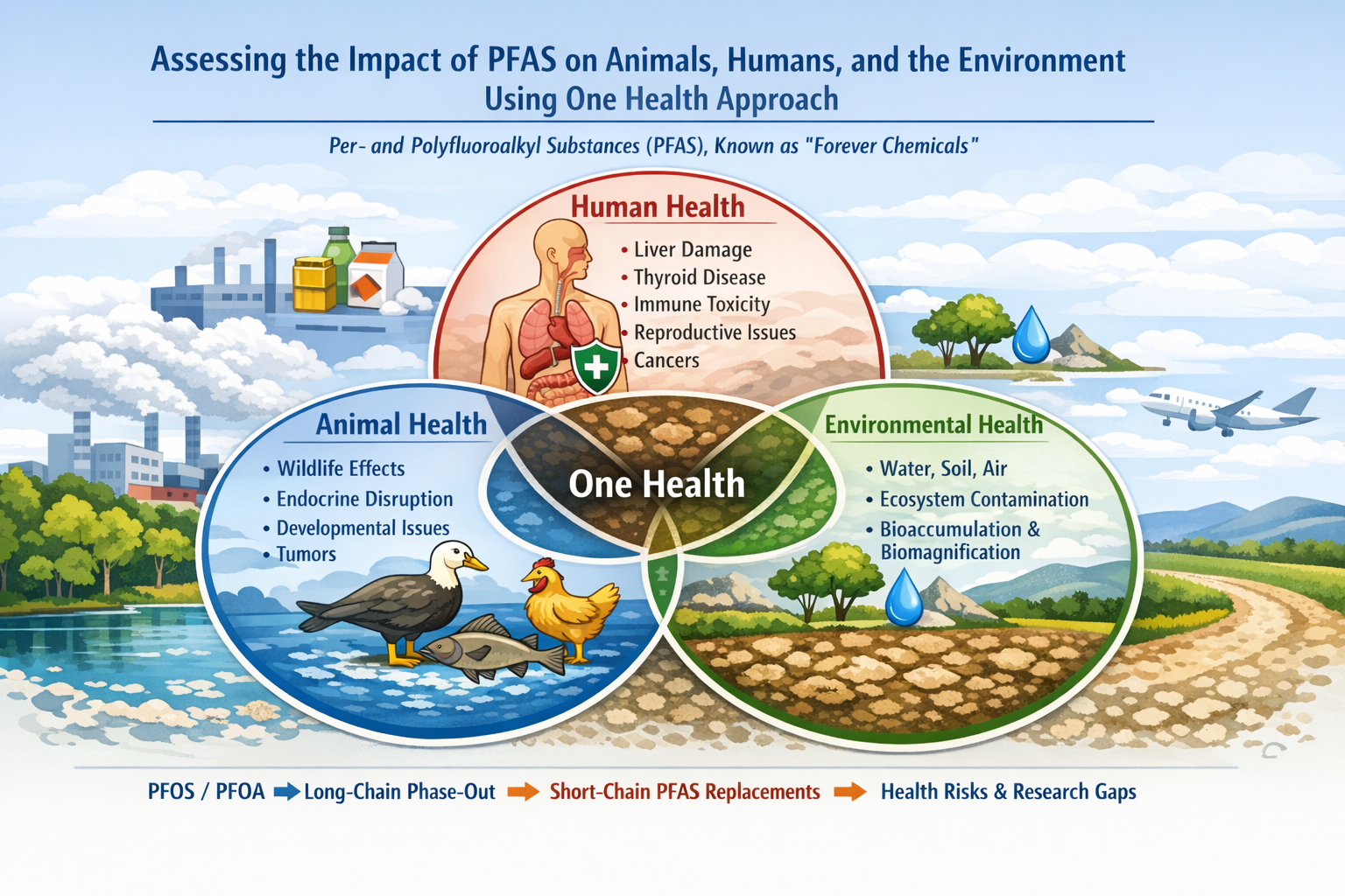 全氟與多氟烷基物質(PFAS)是一類具備氟化碳鏈的合成化學物質,其結構賦予其獨特的物理化學性質。PFAS被廣泛應用於工業及消費性產品中,包括紡織品、食品包裝材料與滅火泡沫等。由於PFAS在環境中具有高度持久性,因此被稱為「永久性化學物質」(forever chemicals)。PFAS的穩定性使其能夠廣泛擴散到不同的環境介質(水、土壤、空氣)和多種暴露途徑(例如飲食)。這導致PFAS的生物累積性和生物放大性,對生態系統和人類健康構成重大威脅。暴露PFAS與多種不良健康效應有關,包括肝損傷、甲狀腺疾病、免疫毒性、生殖問題以及人類和動物的多種癌症。儘管監管措施已逐步淘汰長鏈PFAS,如全氟辛烷磺酸(PFOS)與全氟辛酸(PFOA),但新興研究顯示,其短鏈替代物也可能有健康疑慮。本篇論文運用「健康一體(One Health)」框架,探討這些污染物在人類、動物與環境健康之間的相互影響。此外,本研究亦指出阻礙全面風險評估與管理的知識缺口,並強調亟需跨領域方法及全球協調策略,以因應PFAS所帶來的多重挑戰。