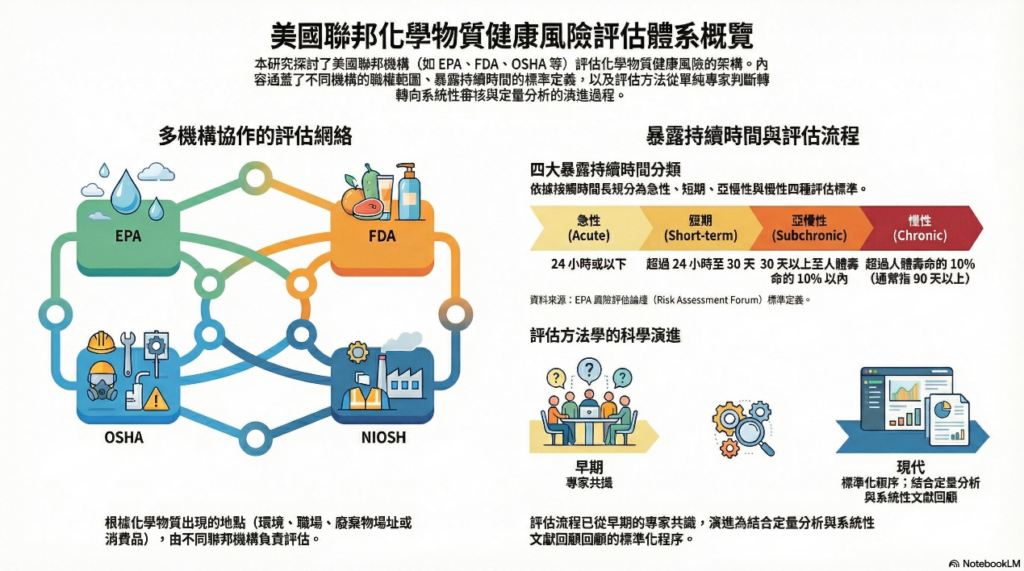 - 跨機構的化學品評估框架:文獻提供了一個視覺化的概述,說明美國不同的聯邦機構(如環保署 EPA、國立職業安全衛生研究所 NIOSH、職業安全衛生署 OSHA、毒性物質與疾病登錄署 ATSDR、食品藥物管理局 FDA 以及消費品安全委員會 CPSC)如何根據化學品出現或使用的場所(環境、工作場所、危險廢棄物場址、食品/化妝品或消費品)來進行化學品評估。