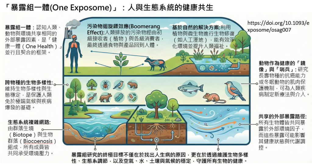 日本文部科學省近期已將健康一體 (One Health) 與暴露組(exposome)研究列為未來國家科研戰略重點之一,凸顯國際健康與環境研究正加速朝向跨物種、跨尺度與跨生態系整合的方向發展。在此脈絡下,近期發表於 Exposome 的文章〈Inviting ecosystems into the exposome framework〉,進一步將暴露組研究由傳統的人體健康視角,拓展至涵蓋整體生態系統的 One Exposome 架構。作者指出,人類、動物、植物、微生物與其共同所處的空氣、水、土壤,實際上共享彼此連動的外部暴露環境,因此暴露組研究若僅聚焦於人類疾病,已不足以回應當代健康與環境挑戰。這篇文章的重要性,在於它不僅補強了 One Health 與 exposome 之間的理論連結,也與日本文部科學省所反映的國際科研布局趨勢相互呼應,顯示前沿研究正逐步由「理解致病暴露」拓展至「維護生態穩定與健康共益」的新階段。